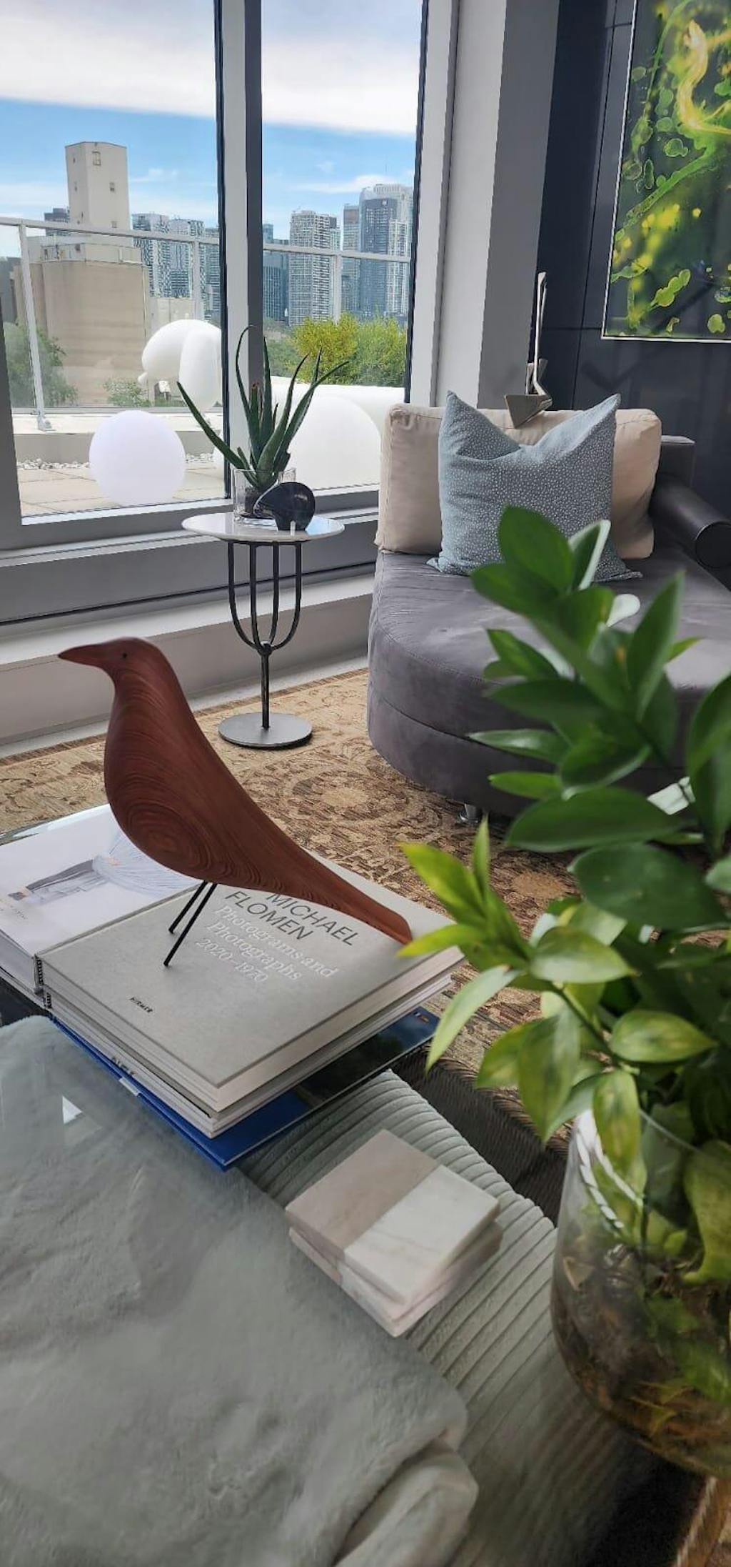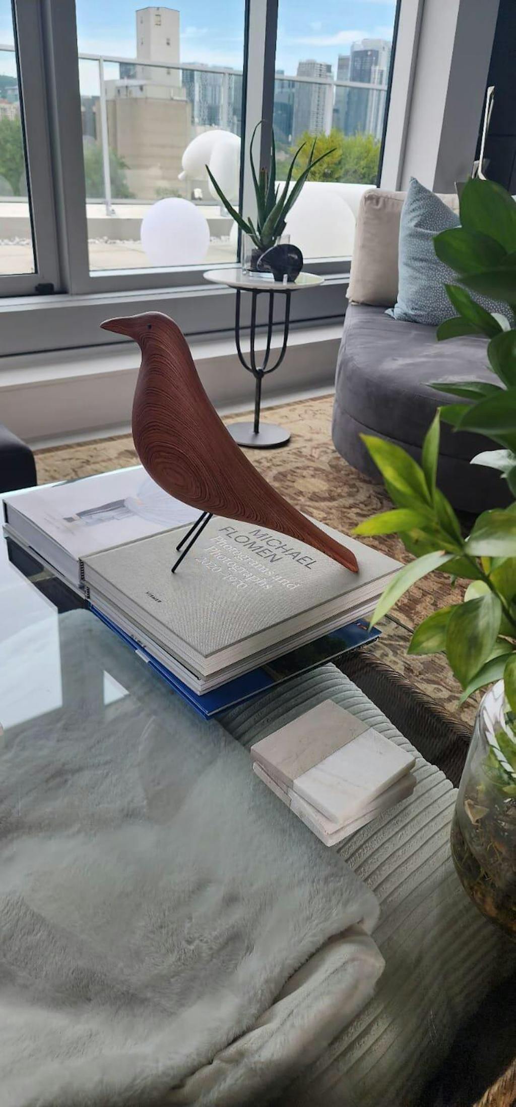 Charles et Ray enrichissaient le Collage de leur maison par les nombreux objets qu’ils rapportaient de leurs voyages. Au milieu du living on peut voir depuis plus de cinquante ans une sculpture d’oiseau en bois noir sur le sol, qui est une pièce de Folk Art américain, particulièrement appréciée par Charles et Ray et qu’ils utilisèrent souvent comme accessoire dans leurs photos.